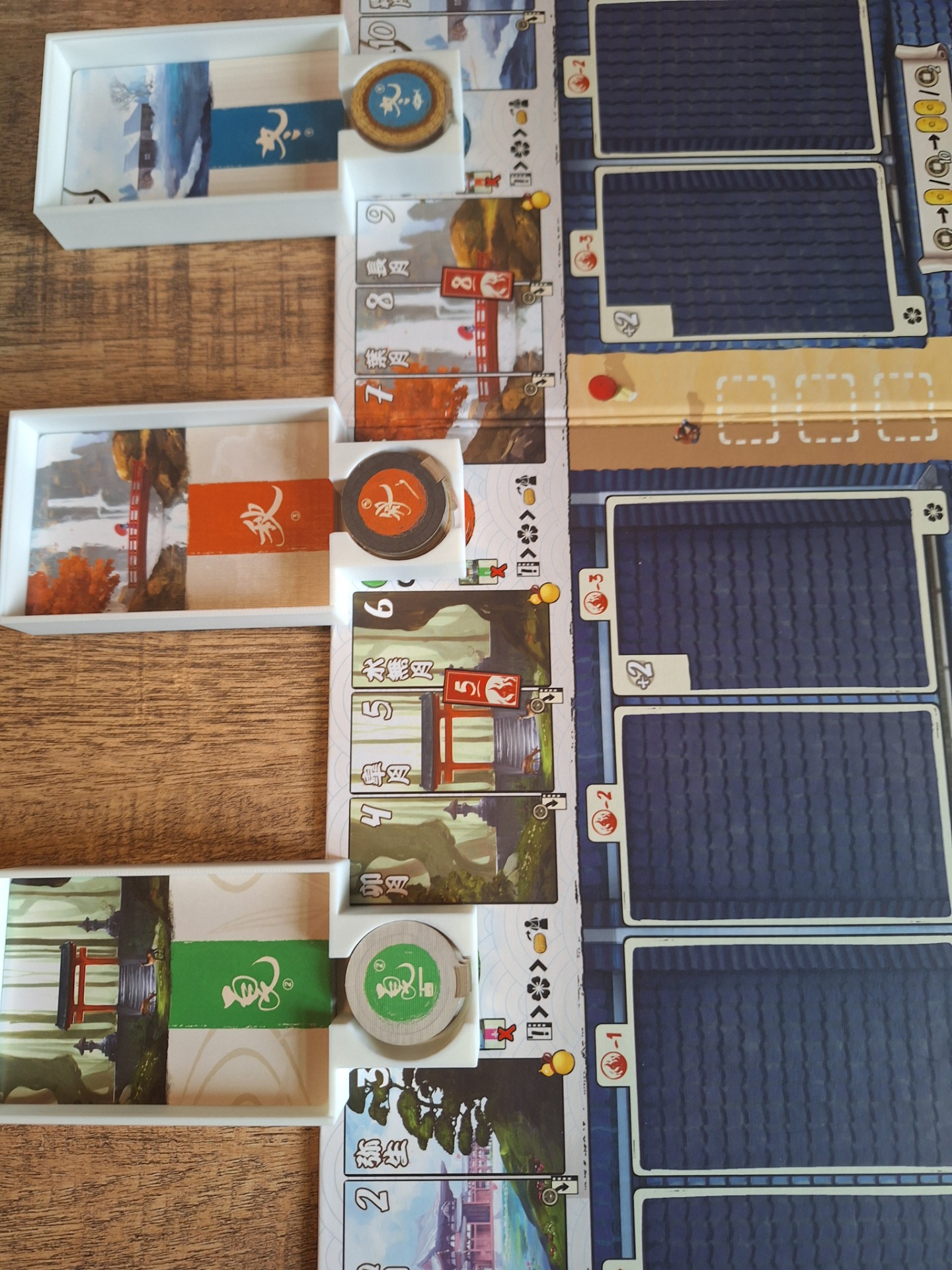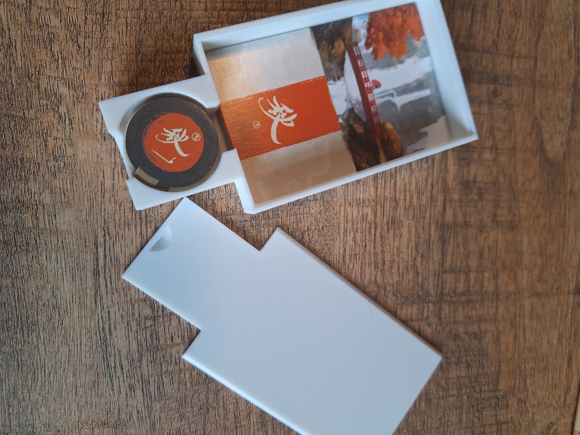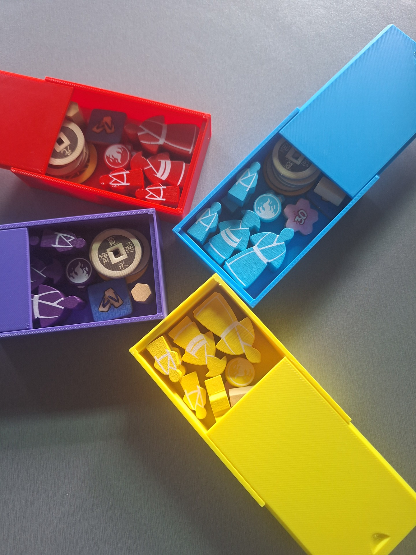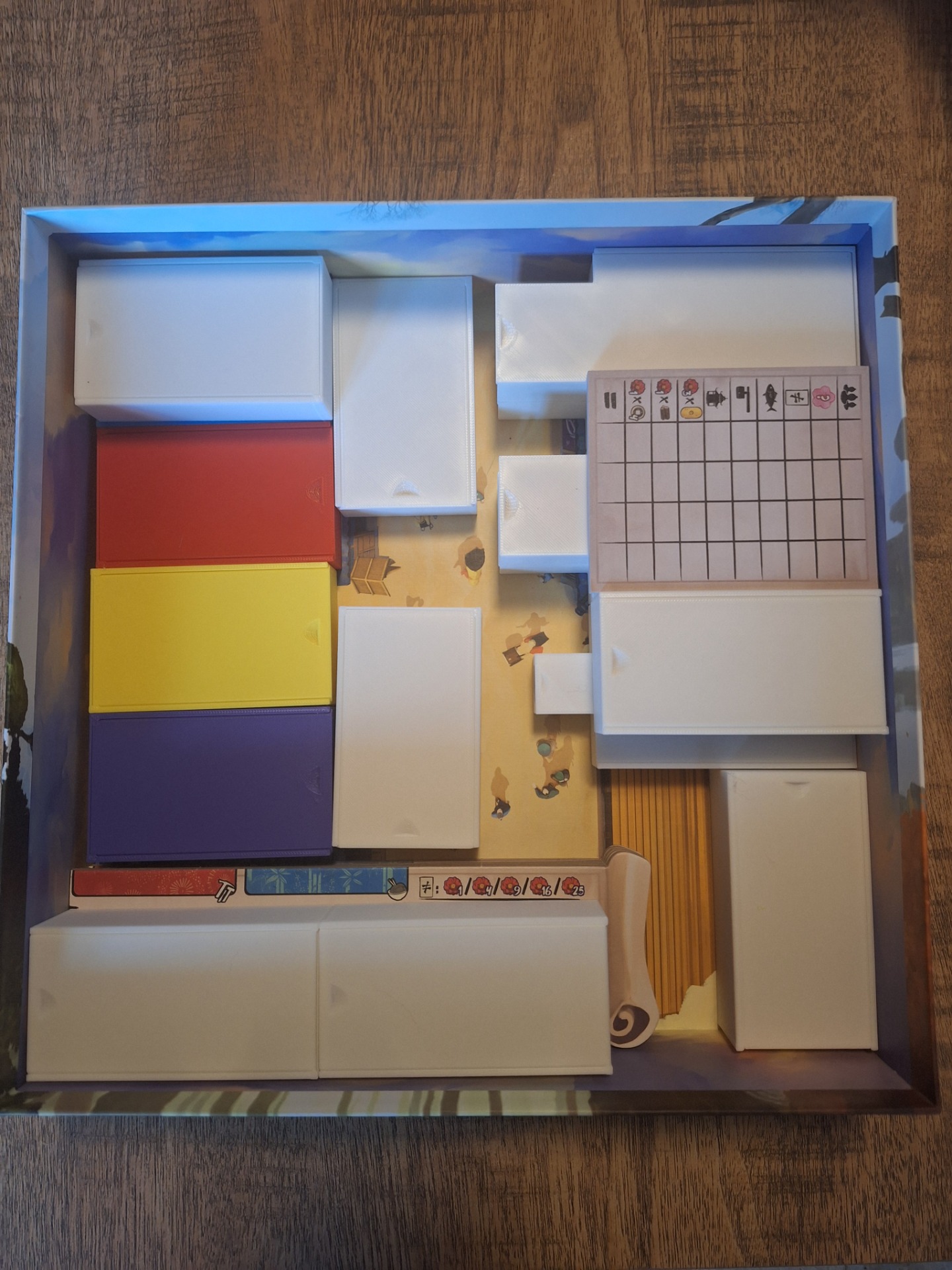 Met deze insert zitten alle onderdelen van Iki netjes opgeborgen in de doos. Spelerskleuren geel, rood, paars en cyaan. Alle andere doosjes in wit (vrij te kiezen).