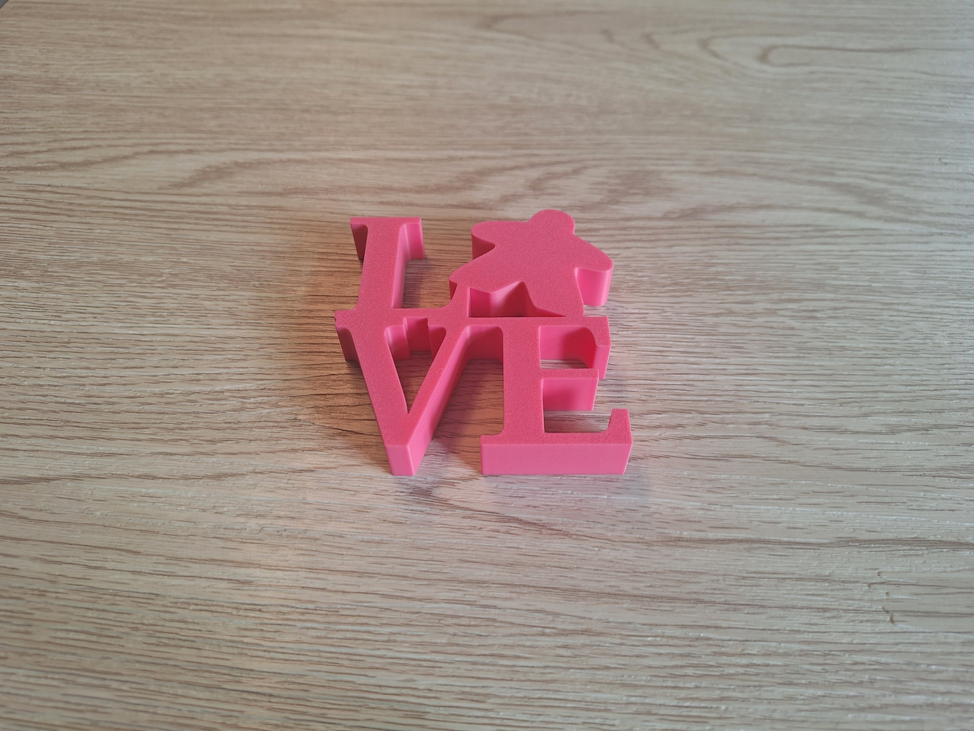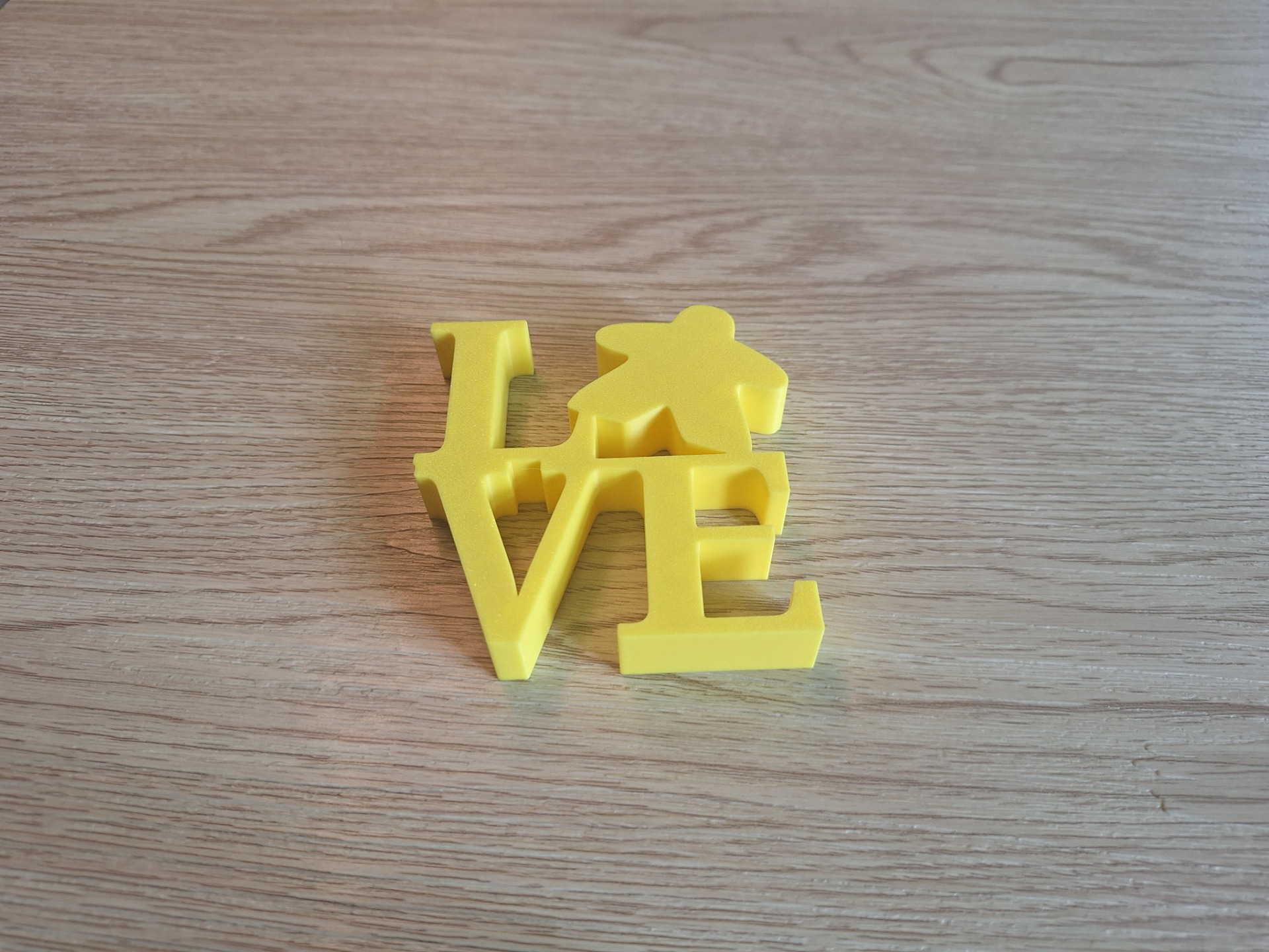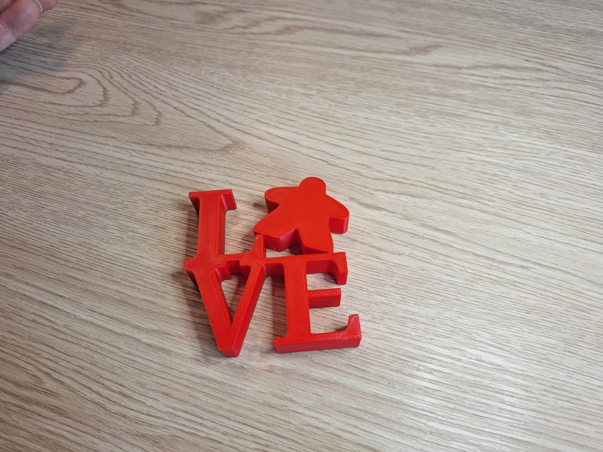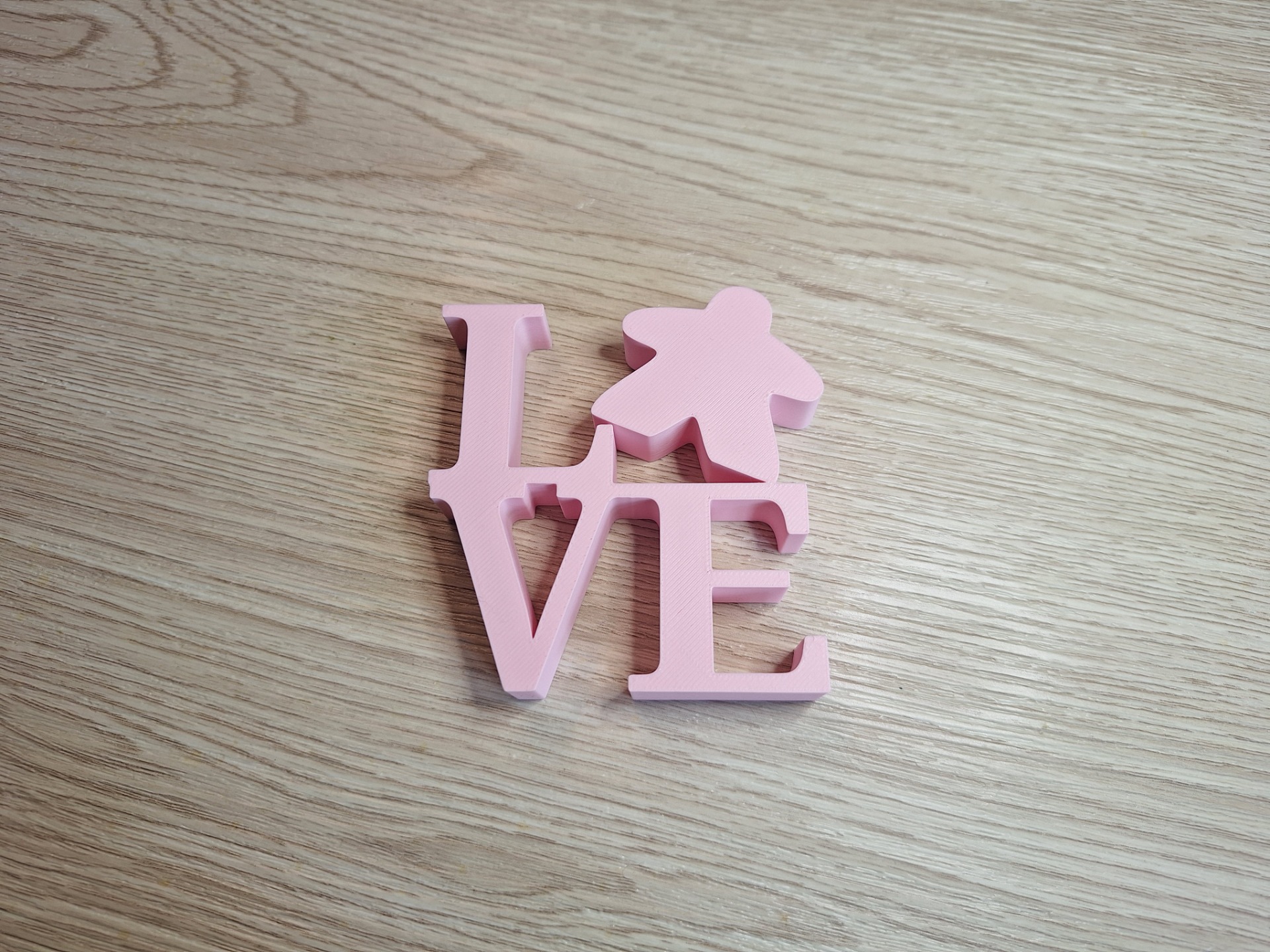 Maak je liefde voor bordspellen zichtbaar met onze kleine Love waarin de O vervangen is door een meeple.
