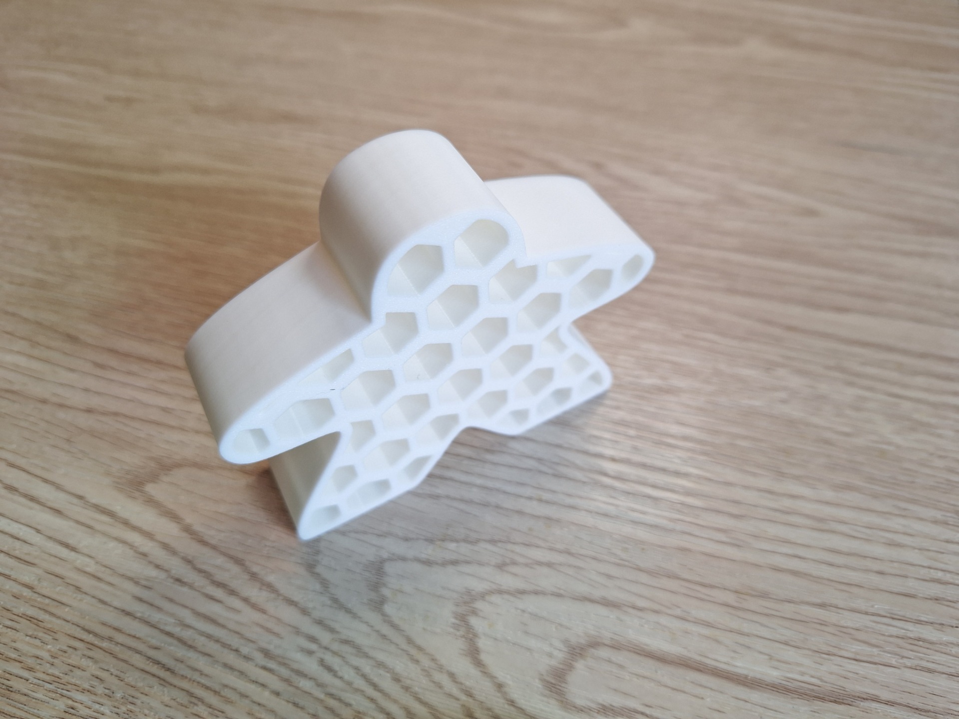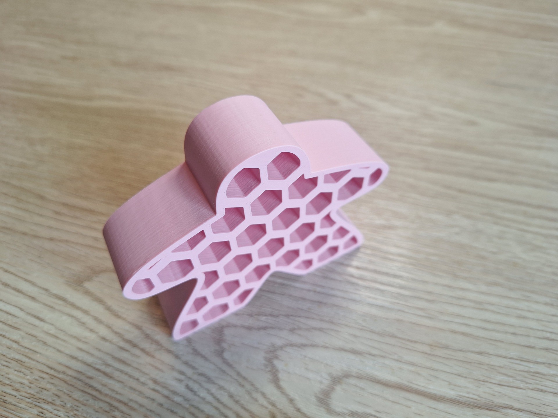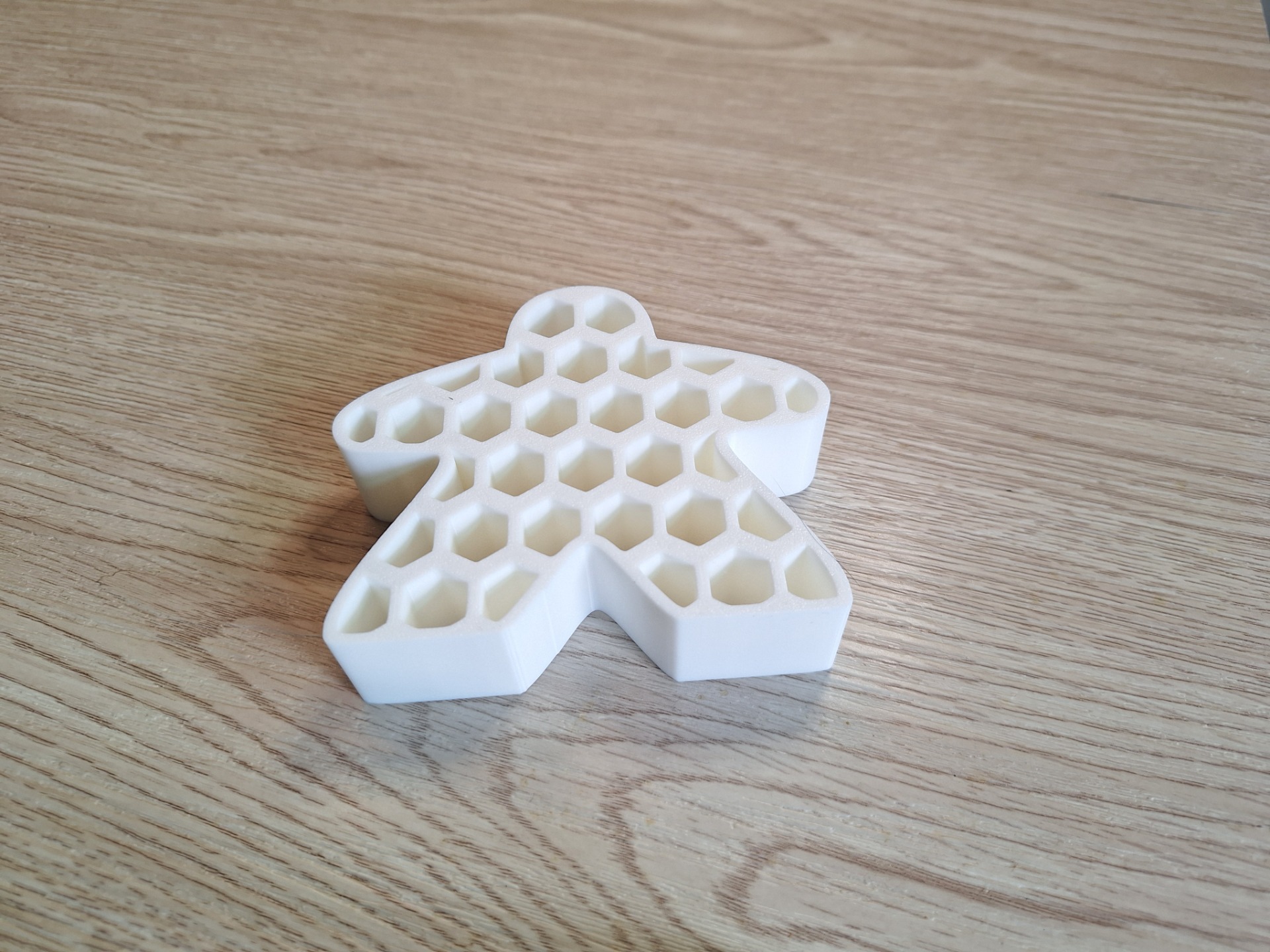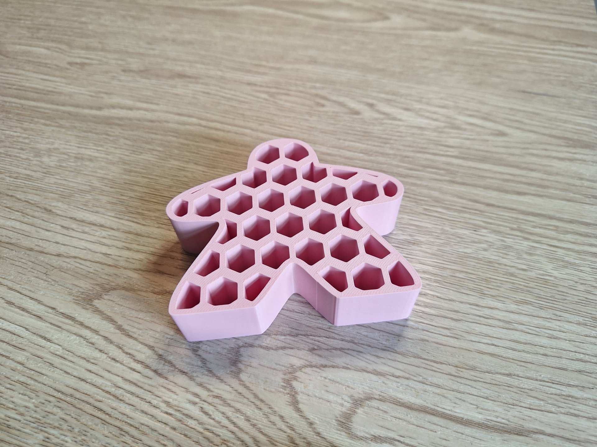 Deze meeple meet: 8,5cm hoog, 10cm breed en 2,5cm diep gevuld met honingraat