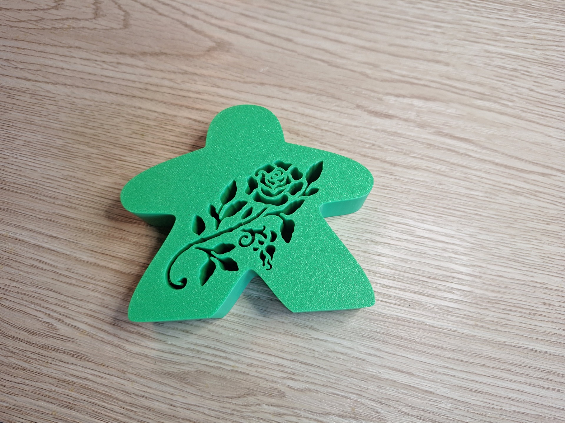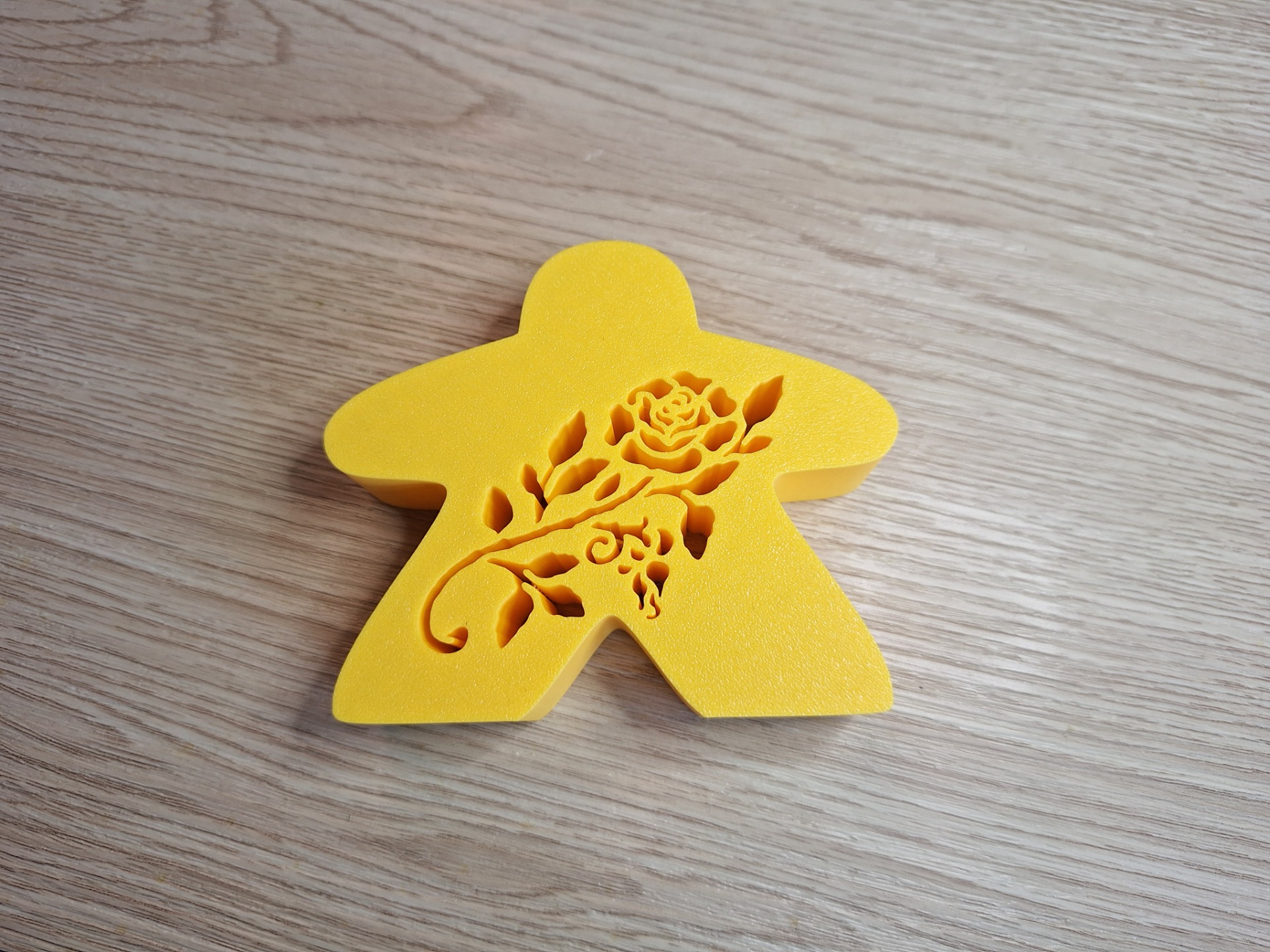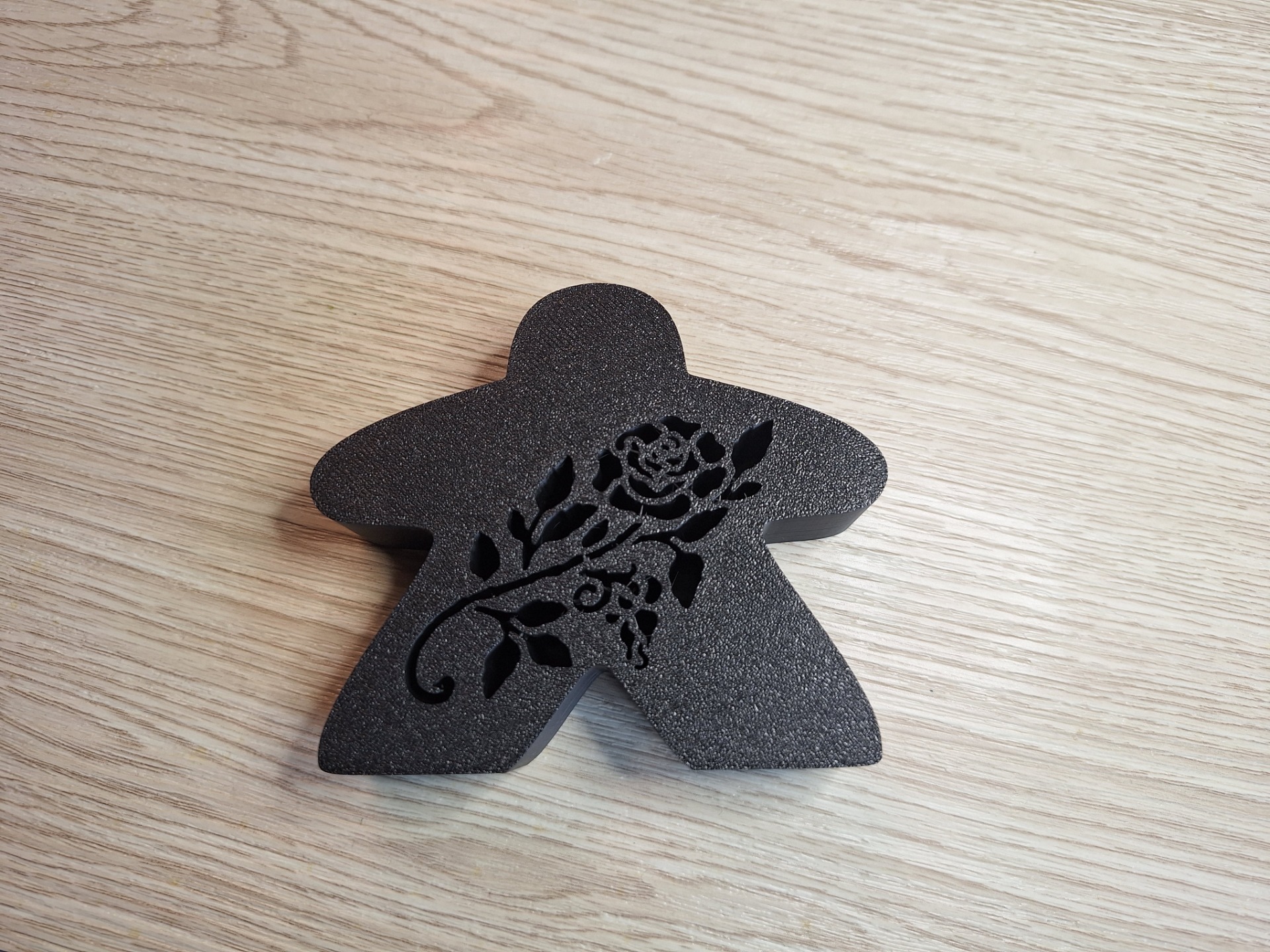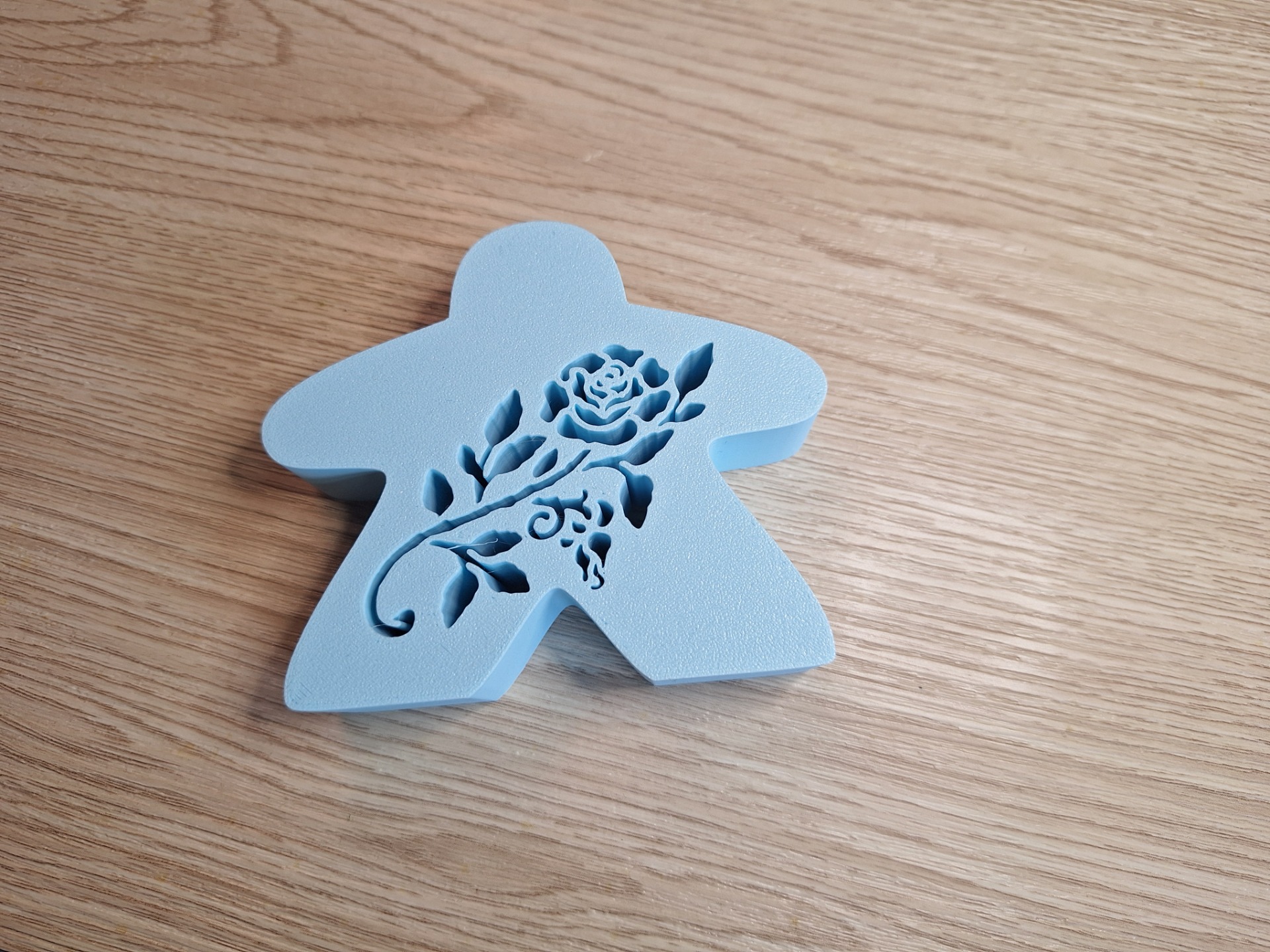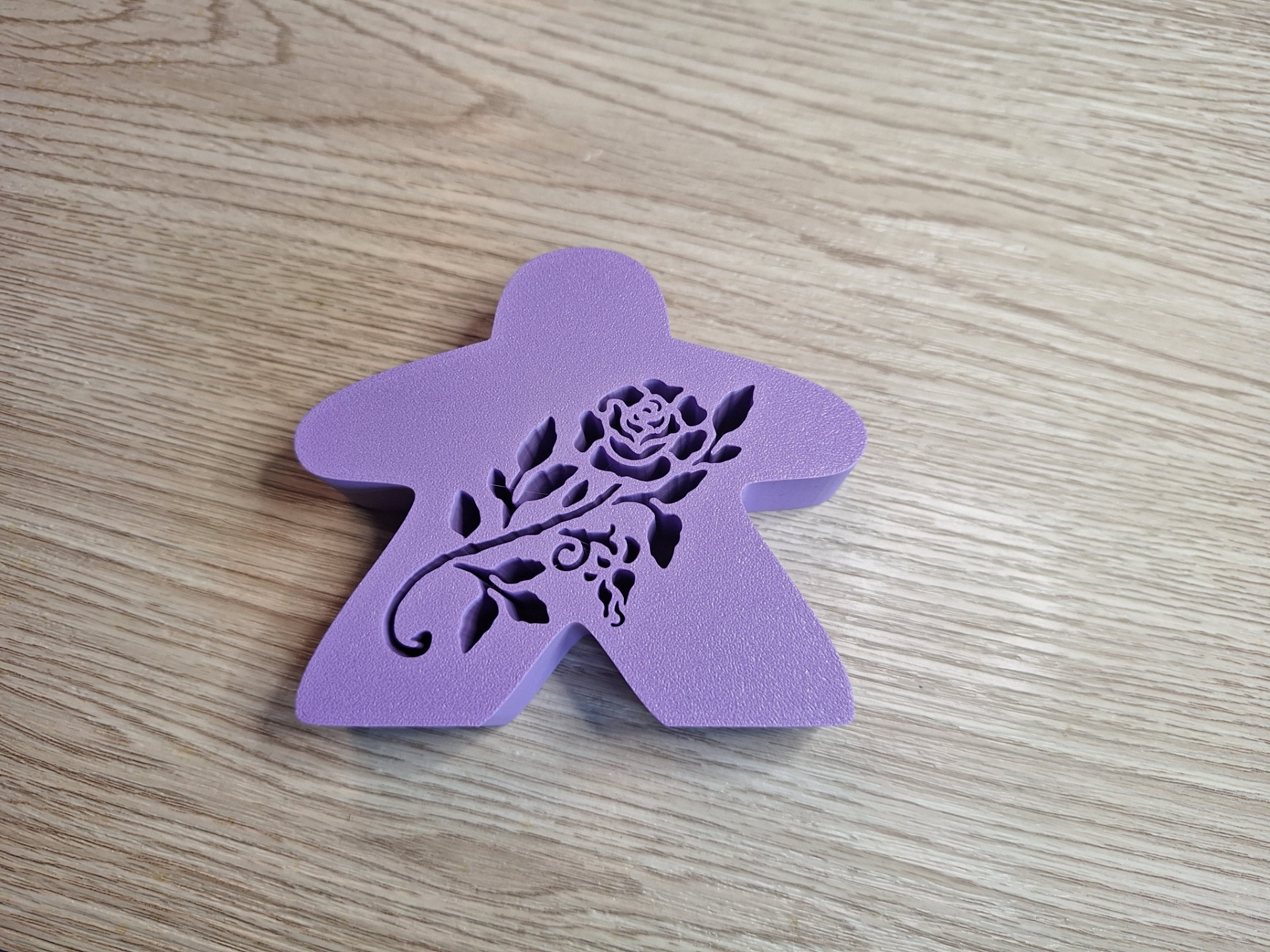 Deze meeple meet: 8,5cm hoog, 10cm breed en 2,5cm diep en bevat een roos uitsnijding