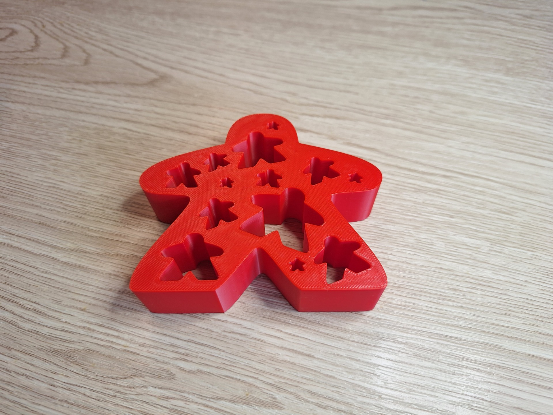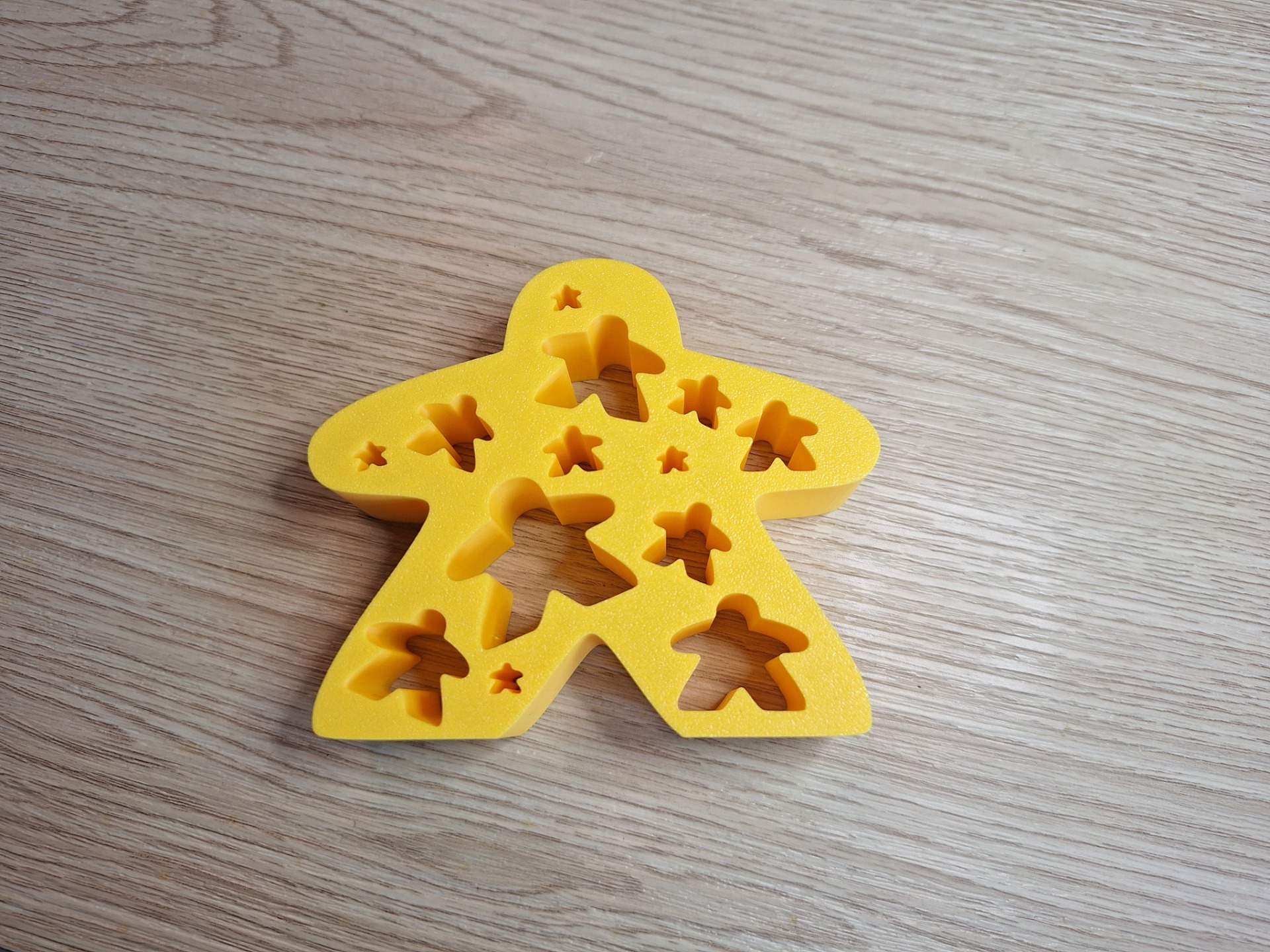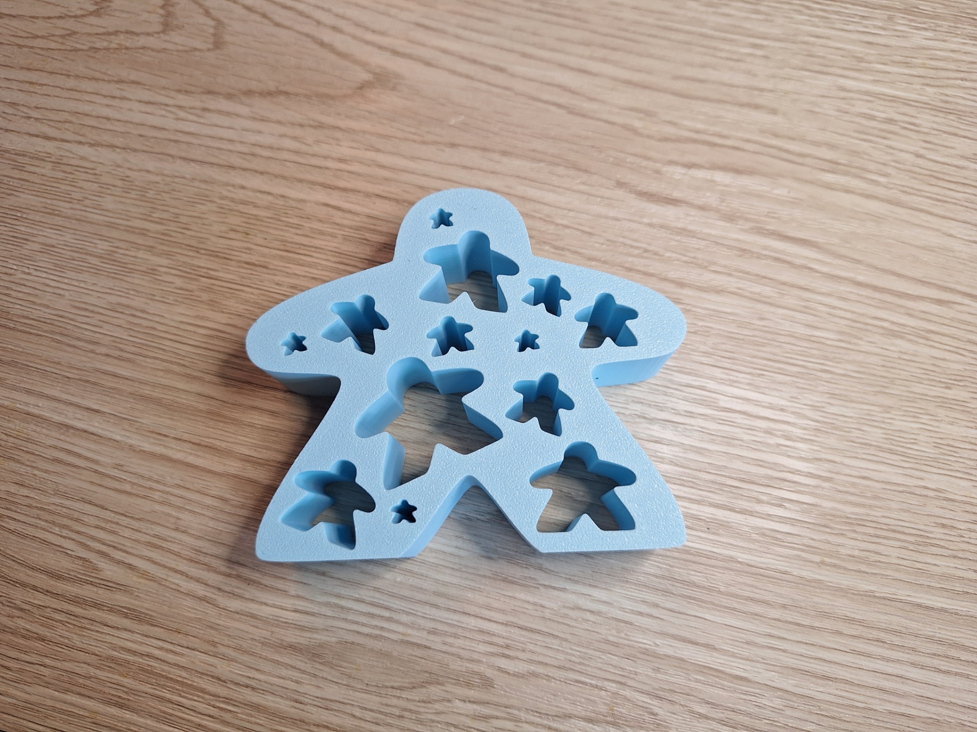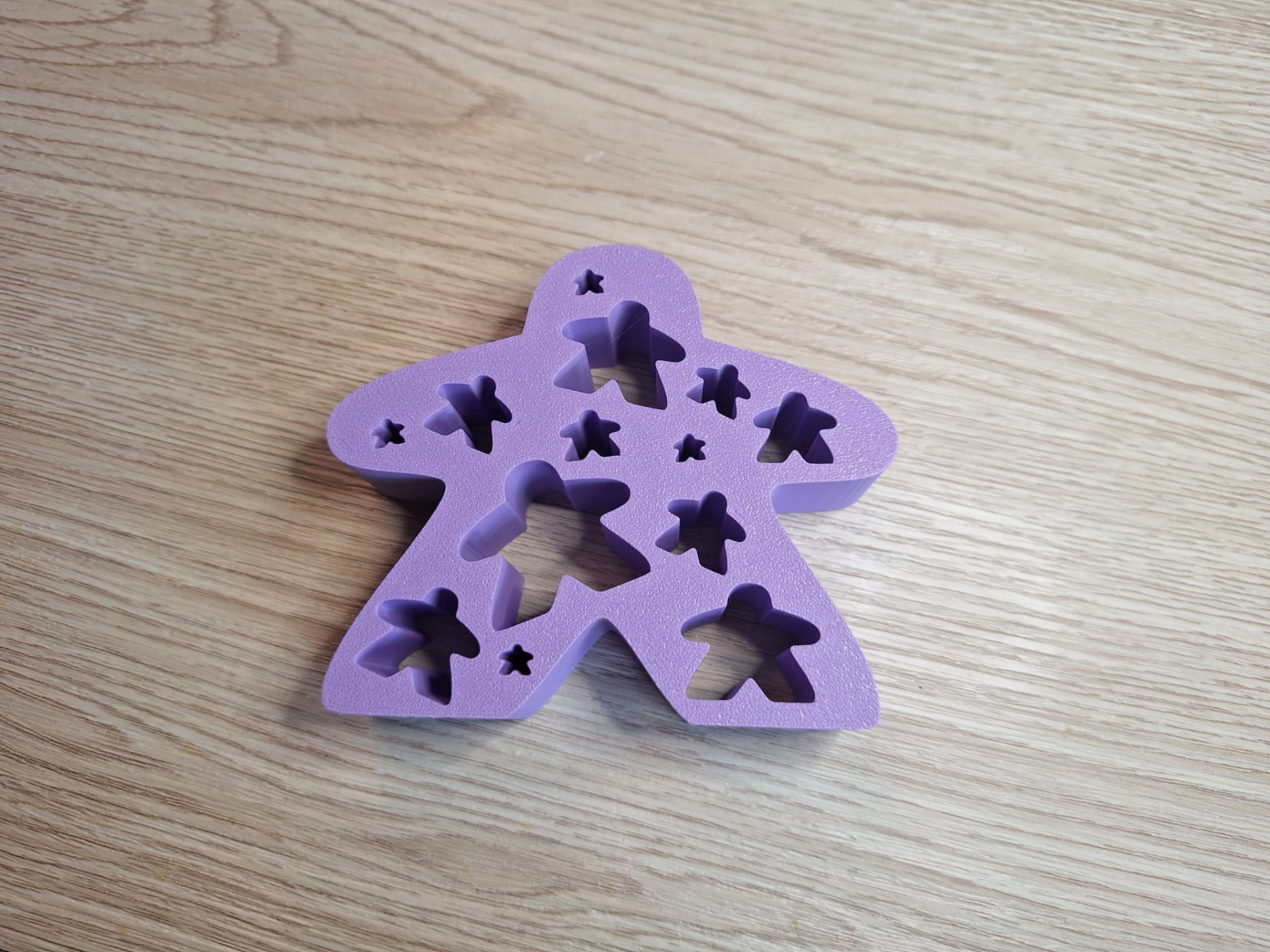 Deze meeple meet: 8,5cm hoog, 10cm breed en 2,5cm diep en heeft meeplevormige uitsparingen