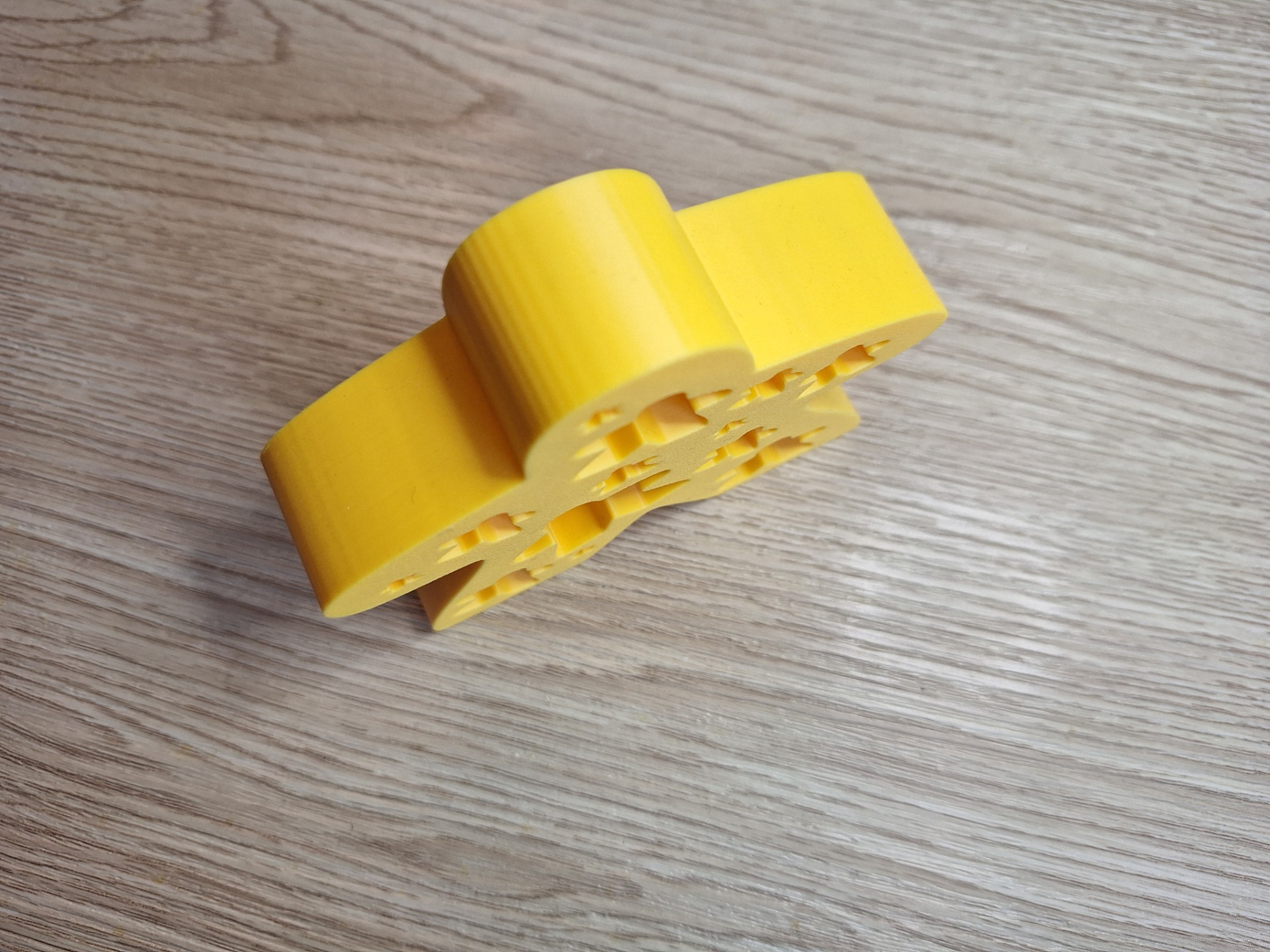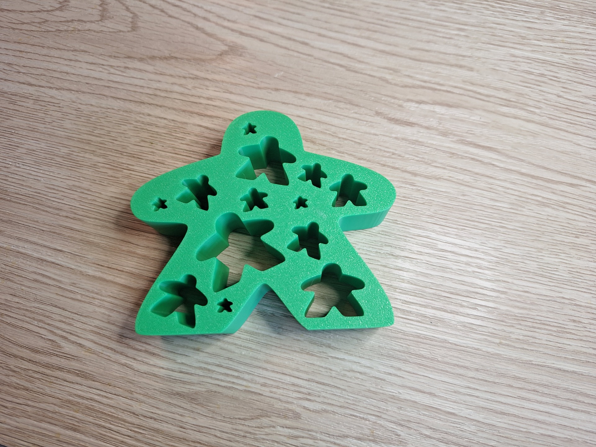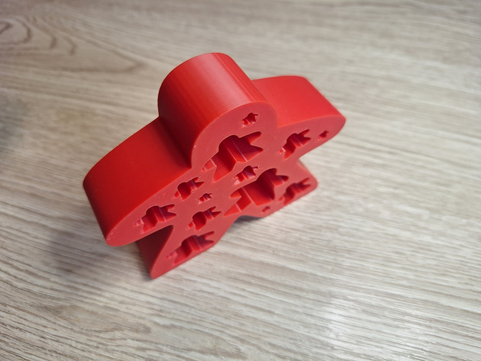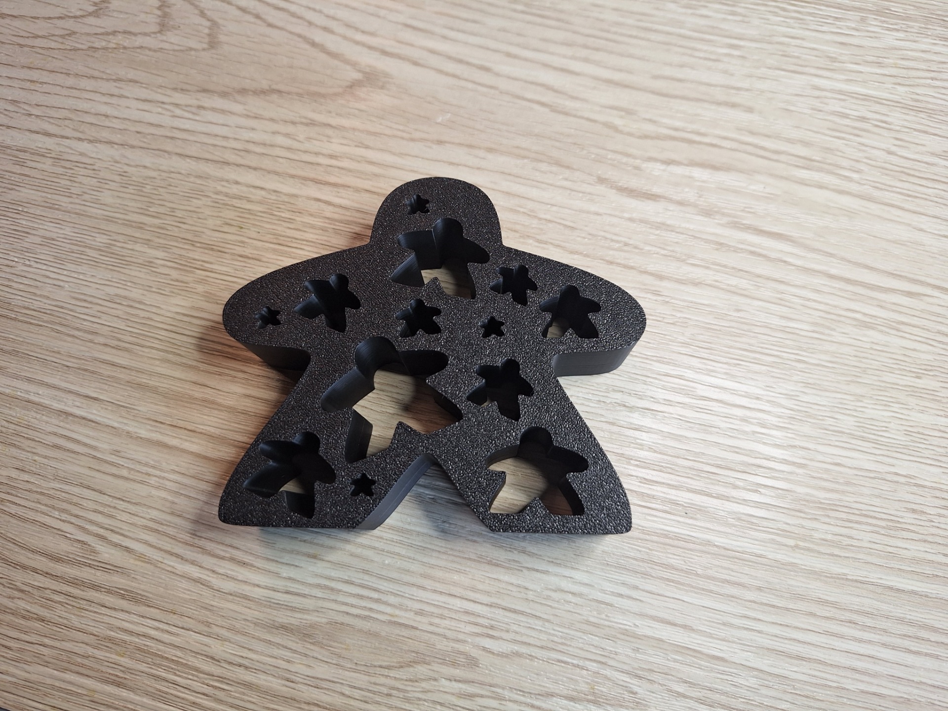 Deze meeple meet: 8,5cm hoog, 10cm breed en 2,5cm diep en heeft meeplevormige uitsparingen